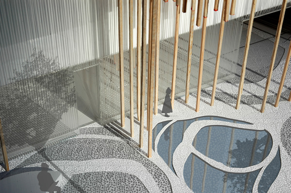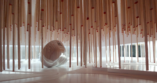 The harmonic movement of the Gömböc is similar to the pulsating city; this feature is magnified by the structure of the pavilion through its dynamically moving vertical elements, creating density at the same time. The hanging wooden rods give the illusion of walking in a forest, while the sparse areas are like glades or city squares. The elements of the wooden installation are like musical instruments; nearly 600 moving sound boxes create an undulating sound space. The inner space of the pavilion is awash in natural sunlight during the day, while a man-made starry sky illuminates the space at night.