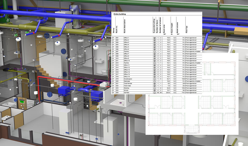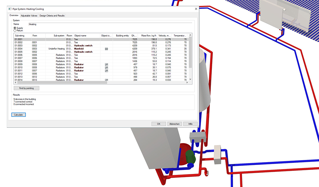 Sanitary & heating system design is based on intelligent objects like pipes and radiators with stored information. This data also serves as starting point for automatic calculations. Design and calculation are integrated – change the model and the calculation will be updated automatically and vice versa. This saves time and prevents errors.