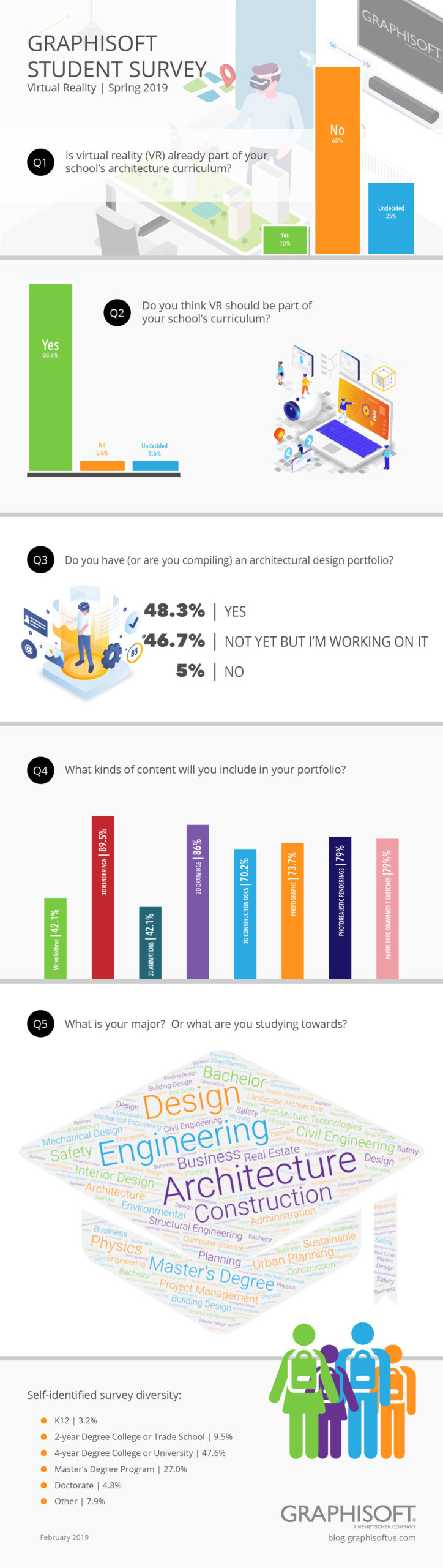 In fact, we surveyed architecture students from 45+ schools across North America, and the most interesting finding is that only 10% of the architecture students surveyed report having access to VR as part of their school’s course offerings, while nearly 90% of these same students think virtual reality should be available in the curriculum.