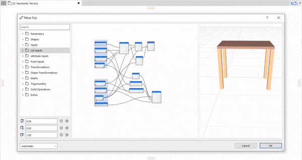 A caixa de diálogo apresenta três partes distintas: a estrutura de todos os nós disponíveis agrupados à esquerda, a área de edição no centro e a área de pré-visualização do objeto paramétrico programado.