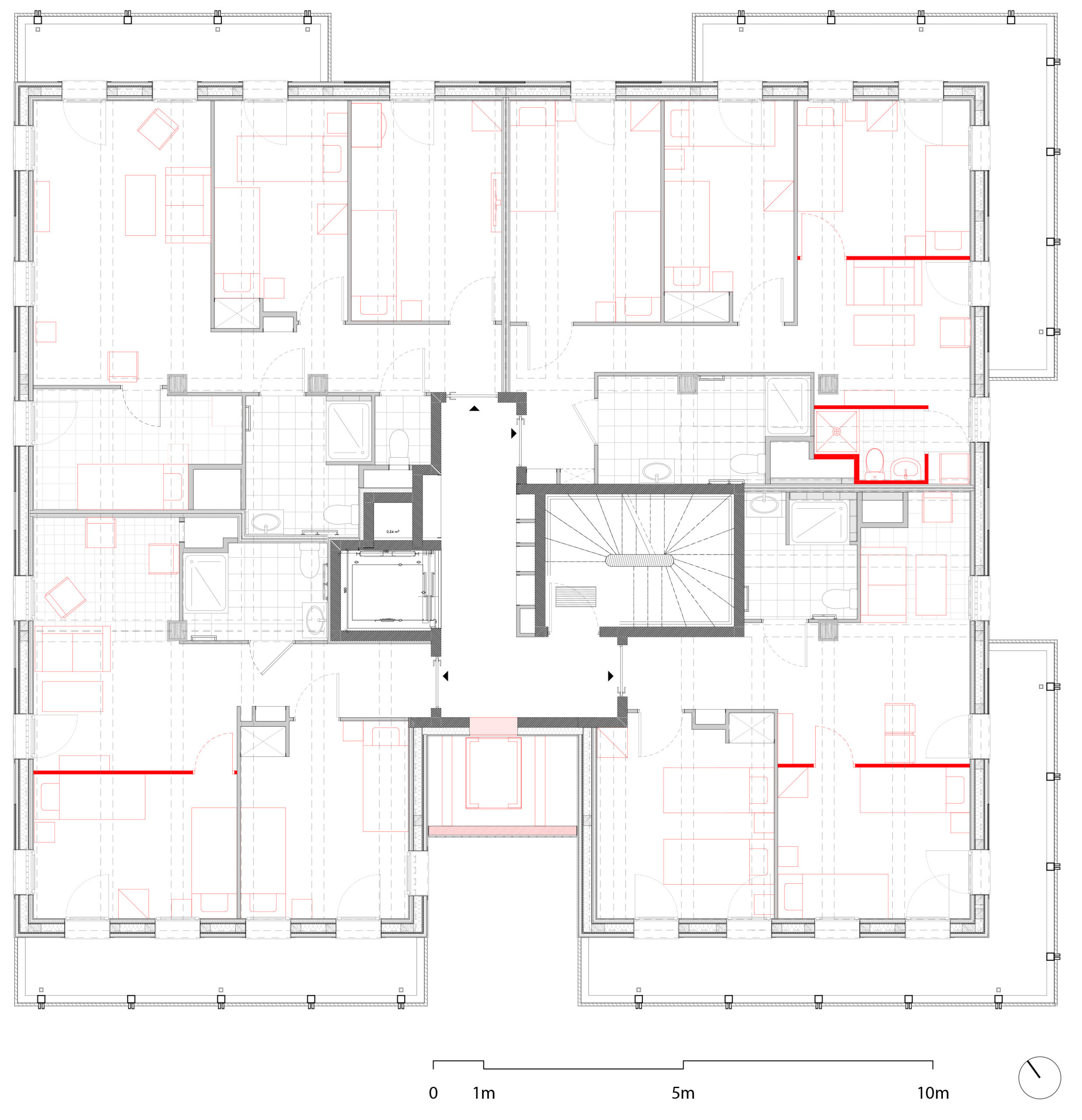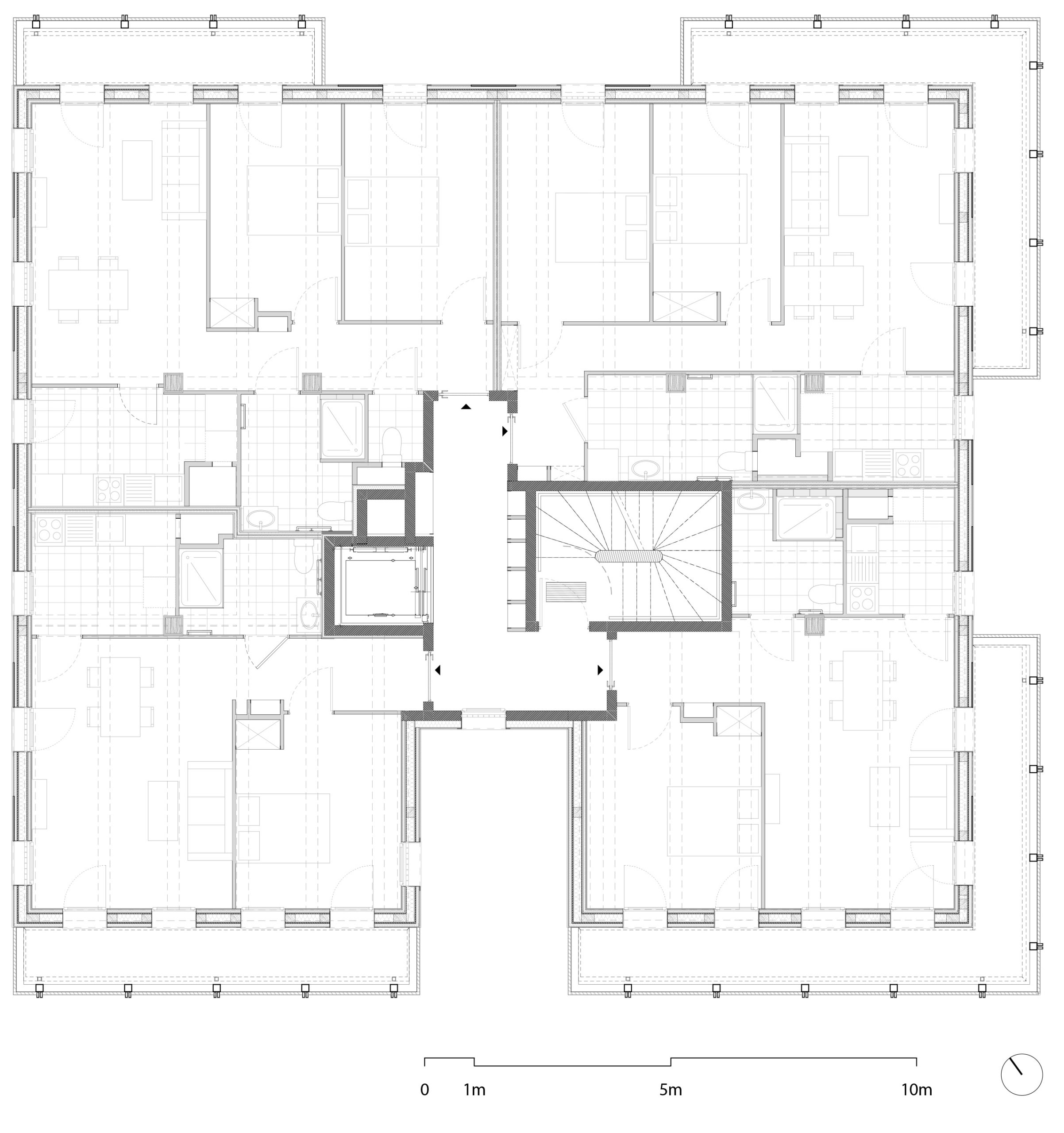 There’s a lot of wood in the building. The slabs are concrete, but we’ve worked hard with all our colleagues to keep the wooden beams visible in the ceilings of the apartments. This gives the apartments a very special character.
