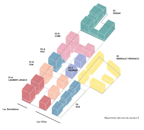 Part of the development known as sector E was designed by a group of seven architectural firms including KOZ Architects, CoBe Architecture et Paysage, and Atelier Georges, together with three developers.