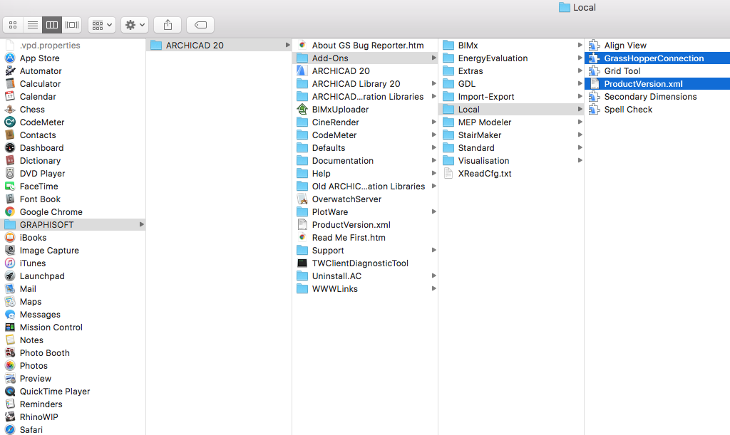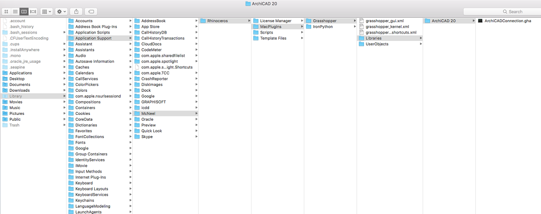 - Go to the following folder: ~/Library/Application Support/McNeel/Rhinoceros/MacPlugIns/ Grasshopper/Libraries/Archicad xx (where xx is the Archicad version number)