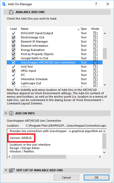 After updating to the latest version, it is recommended to double-check the version number shown in both Archicad and Grasshopper, as described below, to ensure that the update was successful:In Archicad: