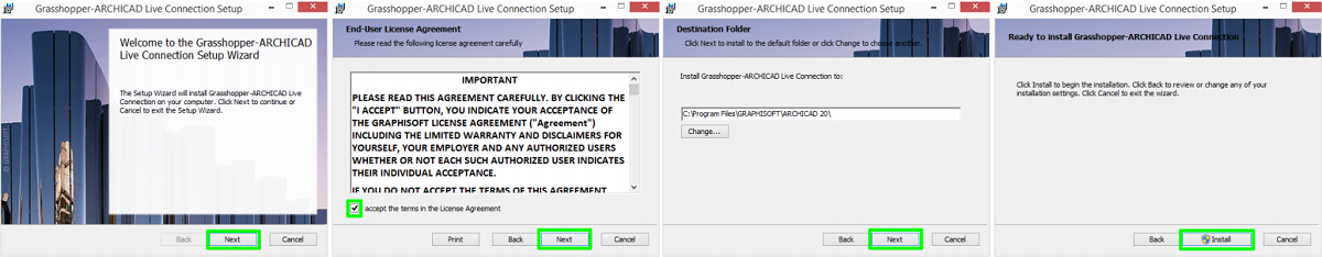 - When Grasshopper – Archicad Live Connection is installed on a computer it is only available for the user who installed it. Although the add-on appears on Archicad’s side for other users as well, it is not available on Grasshopper’s side. So if you want to use Grasshopper – Archicad Live Connection with a different user from the one who originally installed it, uninstall it first, then log in with this second user account and start the installer again.