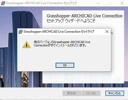 - Grasshopper-Archicad Live Connectionは、2つのArchicadバージョンに同時にインストールすることができません。どちらかのバージョンにすでにインストールされたいる場合は、次のメッセージが表示されます: