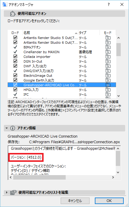 最新のバージョンに更新した後、更新が成功したことを確認するために、ArchicadとGrasshopperの両方に示されているバージョン番号を確認することをお勧めします: