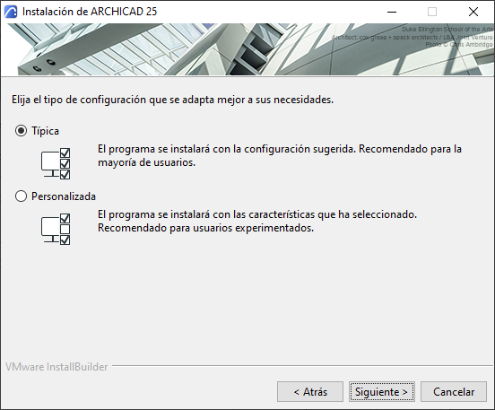 Con la opción «Típica» (recomendada), instalará Archicad 25 juntamente con todos sus demás componentes (p. ej. Biblioteca, Documentación, Ayuda de Archicad, BIMx de Escritorio, etc).