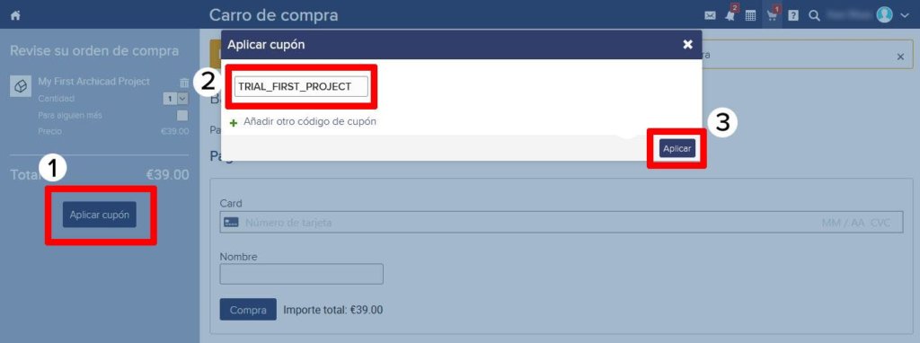 - Escribe el código TRIAL_FIRST_PROJECT en el campo correspondiente (marcado en rojo) y clic en «Aplicar«