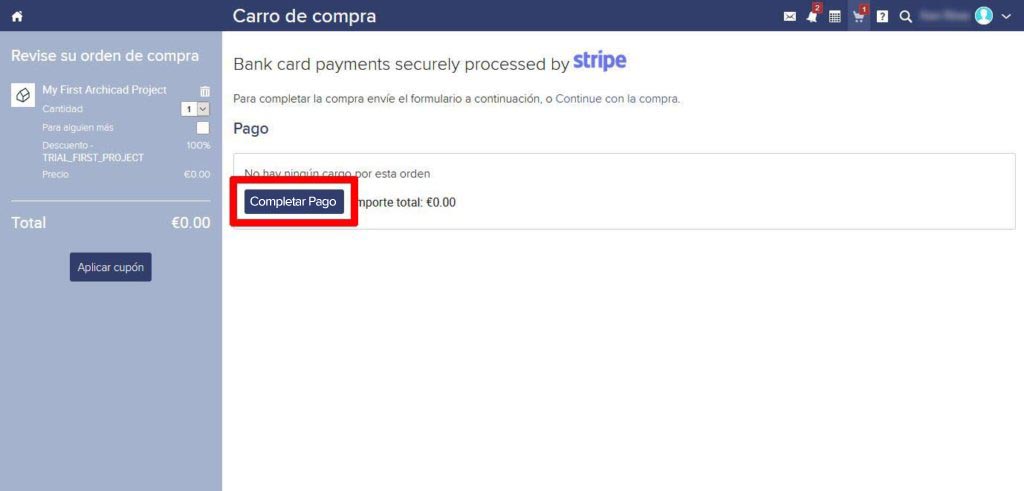- Haz clic en el botón «Completar Pago» (marcado en rojo)