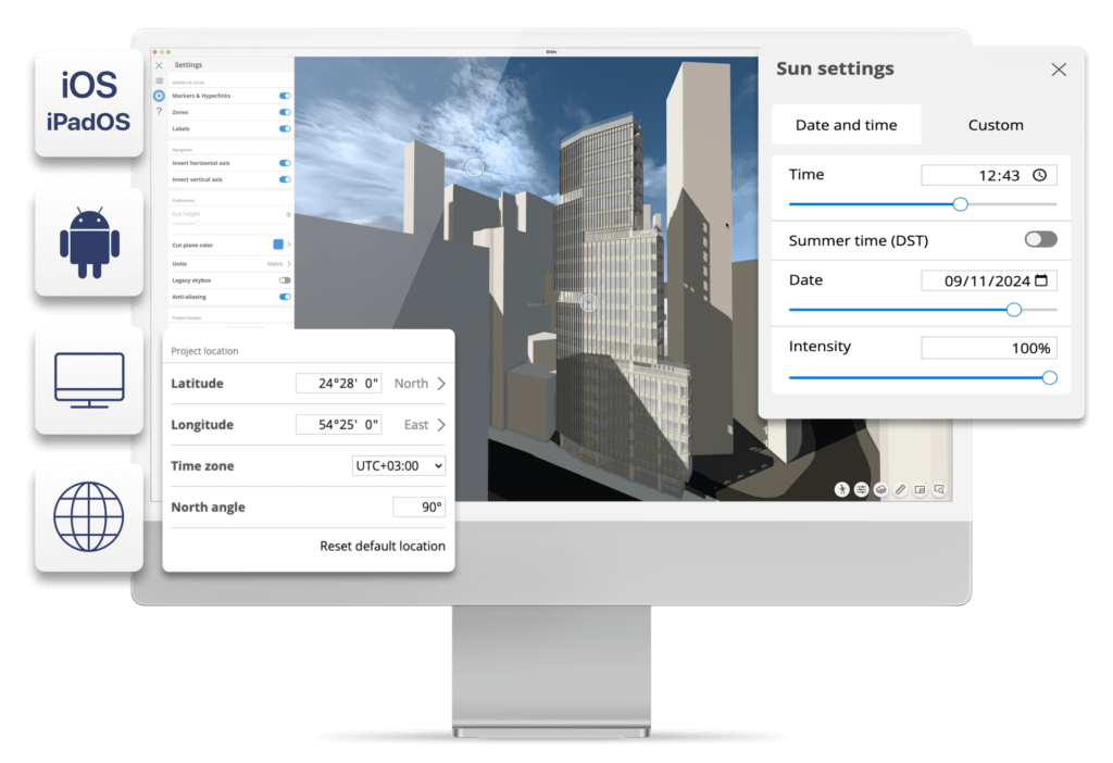 讓你的客戶參與重要的設計決策。使用 BIMx 的準確太陽位置,你便可充分利用自然光並針對環境來優化設計。