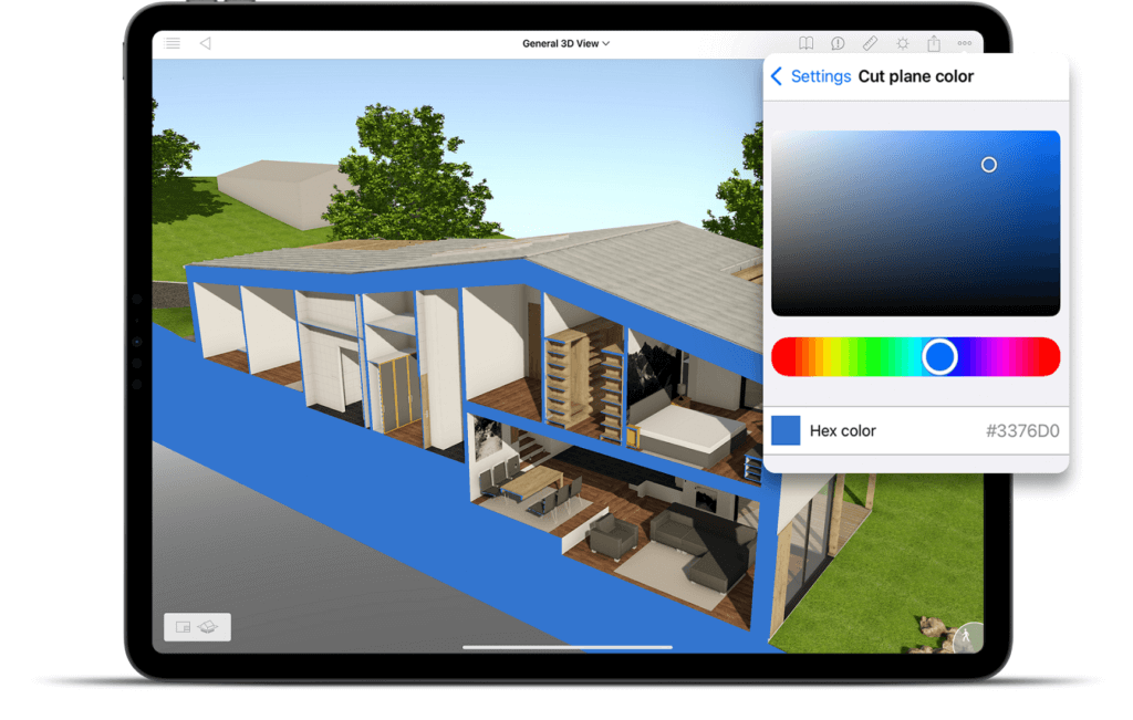 透過改變切割面的顏色來自定義 3D 模型的演示。使用中性色調讓注意力集中在你的設計圖上,或使用你自己的調色板來表現企業形象。