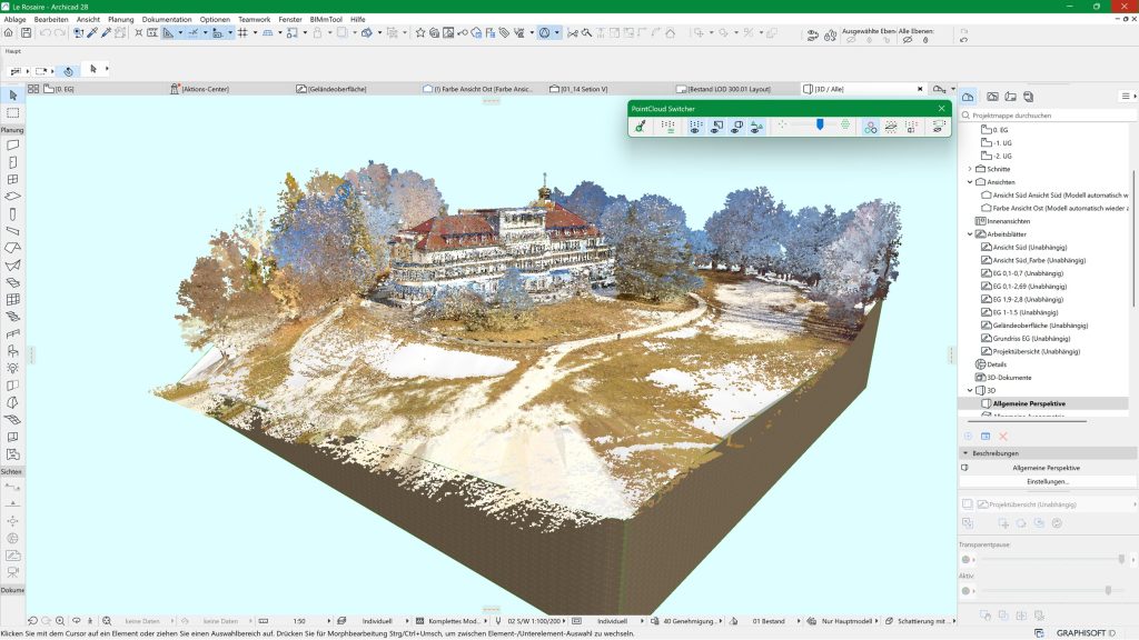 BIMmTool soporta la importación directa de formatos comunes de nubes de puntos, incluyendo Leica, Faro, Riegel y otros – sin necesidad de convertir a e57. Gracias al multiprocesamiento y al muestreo, BIMmTool soporta fácilmente grandes proyectos de escaneado, mientras que el Conmutador Pointcloud permite un control preciso sobre la visualización de la nube de puntos en las vistas de Archicad.