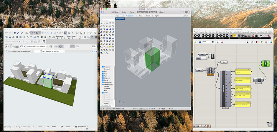 業界初の双方向「ライブ」接続により、WindowsとMac両方でRhinoとGrasshopperをARCHICADに接続できます。これにより、Rhino、Grasshopper、ARCHICADの3つの設計環境の強みを活用して、初期段階の設計とBIMの設計プロセスのギャップを埋めることができます。