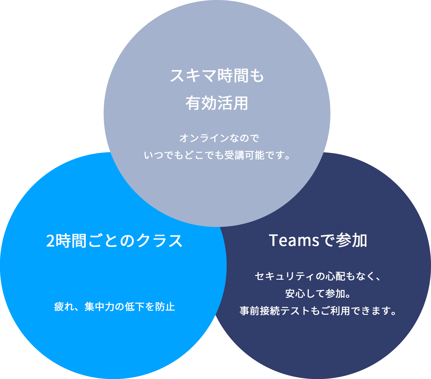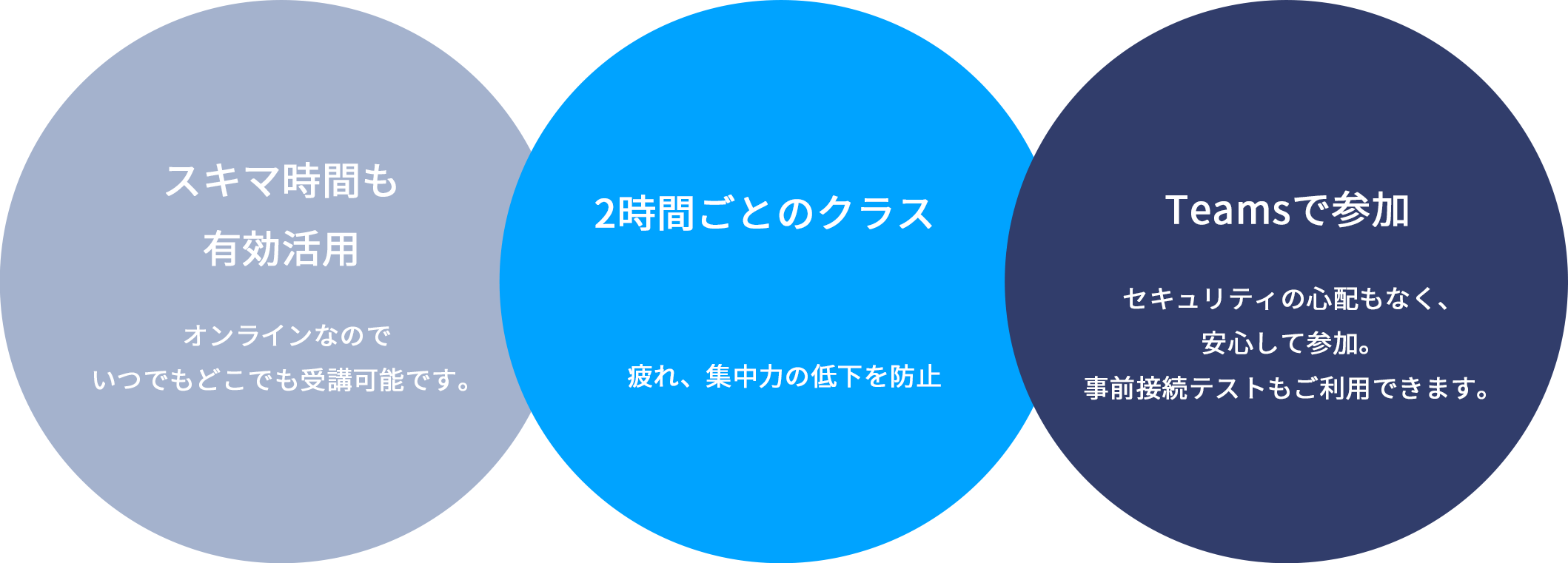 オンラインでのクラスの受講は不安という方も、対面式授業と変わらない学習効果と、それ以上のメリットを体感いただけます。