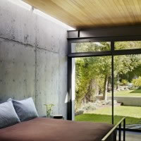 The vegetable garden is so essential to the property that the first building in the project was transforming a dilapidated garden shed into an airy and elegant home office. Next came the home, which was an intriguing challenge on a steeply sloping hillside. Concrete walls along the side lot lines cradle the wooden structure, clad with ipé, a teak-like wood that is sustainably farmed in South America. Ceilings are red cedar native to California.