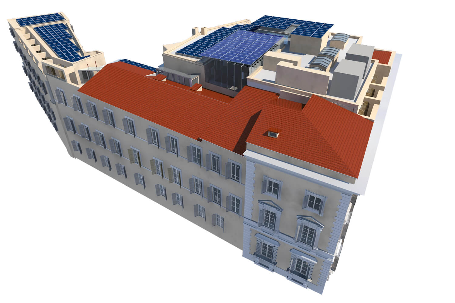 為了保留歷史悠久的克萊門蒂諾宮的完整性以及想像空間,團隊創建了一個三維數字雙生模型,以探索不同的設計和施工方案。項目重新創建了包括BIM模型元素表的數字版本,它將各種元素分開,以便詳細地分類和過濾。