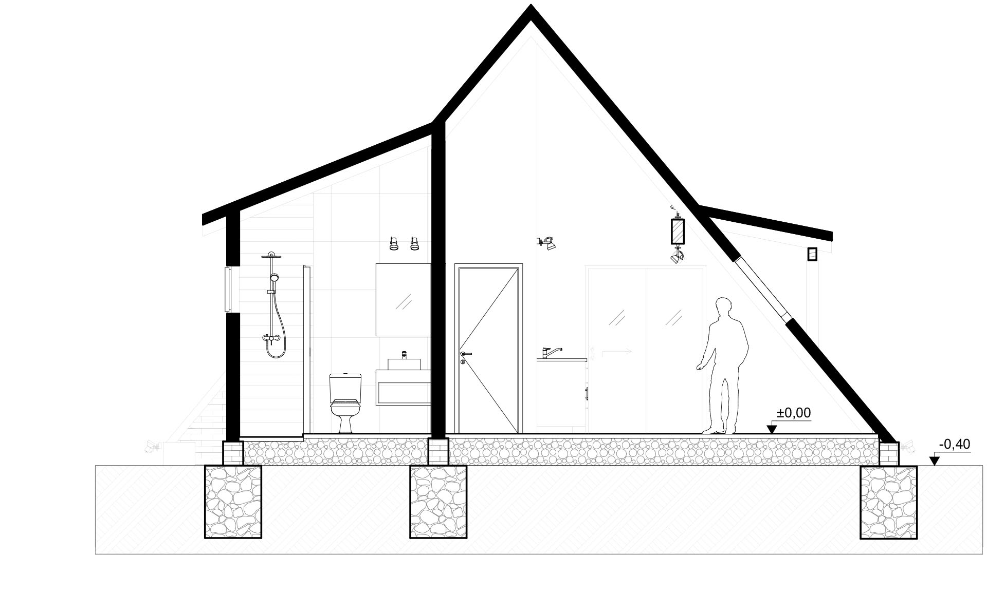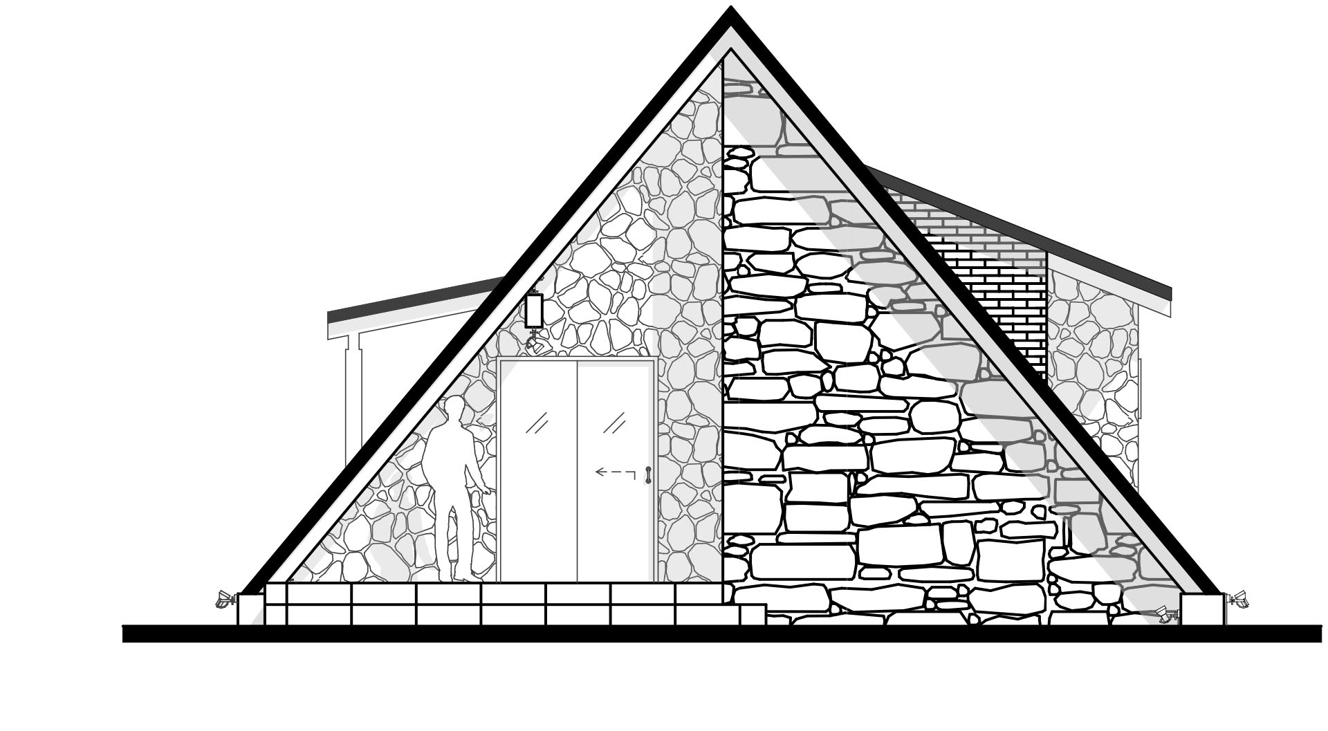La cubierta también tomó inspiración en las típicas viviendas alpinas europeas, de donde provienen los antepasados familiares, con 120% de pendiente en su mayoría, llegando hasta el suelo y cambiando a 40% y 20% en sectores laterales, simulando aberturas basculantes, dando lugar a espacios de mayor aprovechamiento y resaltando el cambio de materiales en la fachada.