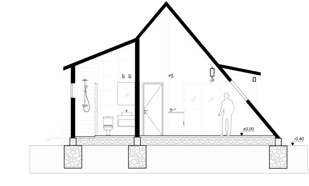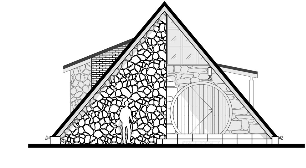 Con un total de 75 m² distribuidos en sala y cocina-comedor integrados, dos dormitorios y un baño completo compartido, se buscó encontrar la integración del proyecto con su entorno natural mediante un diseño que se inspira en la arquitectura de la zona, los gustos particulares del cliente y materiales exteriores en su estado bruto-natural, tales como ladrillos y revestidos de piedras lajas y diabasas, siendo estas últimas, exclusivas de la cantera de Caazapá, con pequeños cristales que brillan por la incidencia solar-lunar.