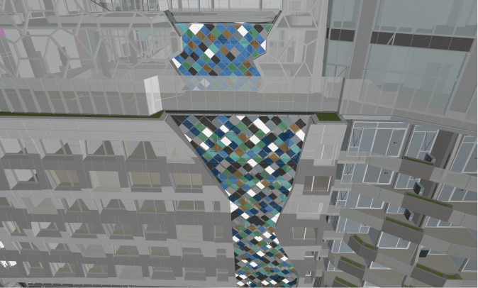 Diseñados con la ayuda de la herramienta Muro Cortina de Archicad, los sorprendentes edificios presentan múltiples y complejas fachadas con diferentes facetas y ángulos que se retuercen y giran a medida que se elevan los rascacielos. La fachada de piedra azul que rodea el hotel Ritz Carlton presenta nueve tipos de piedra con diferentes planos y niveles.
