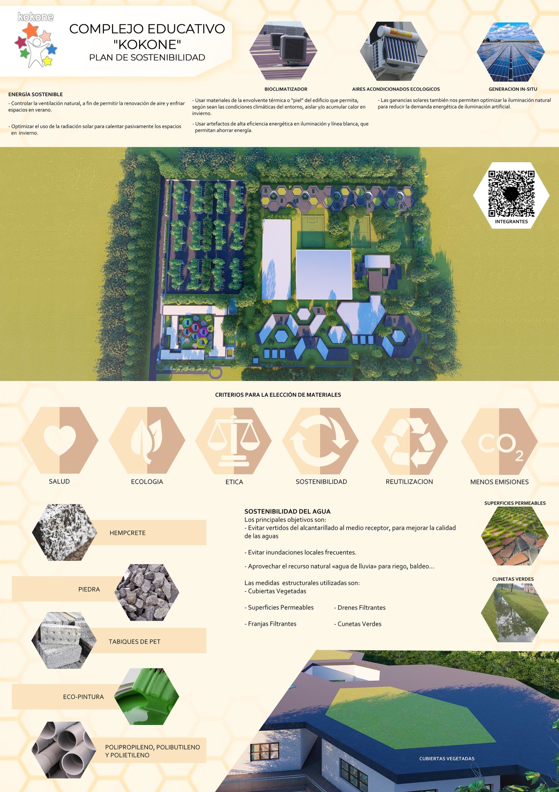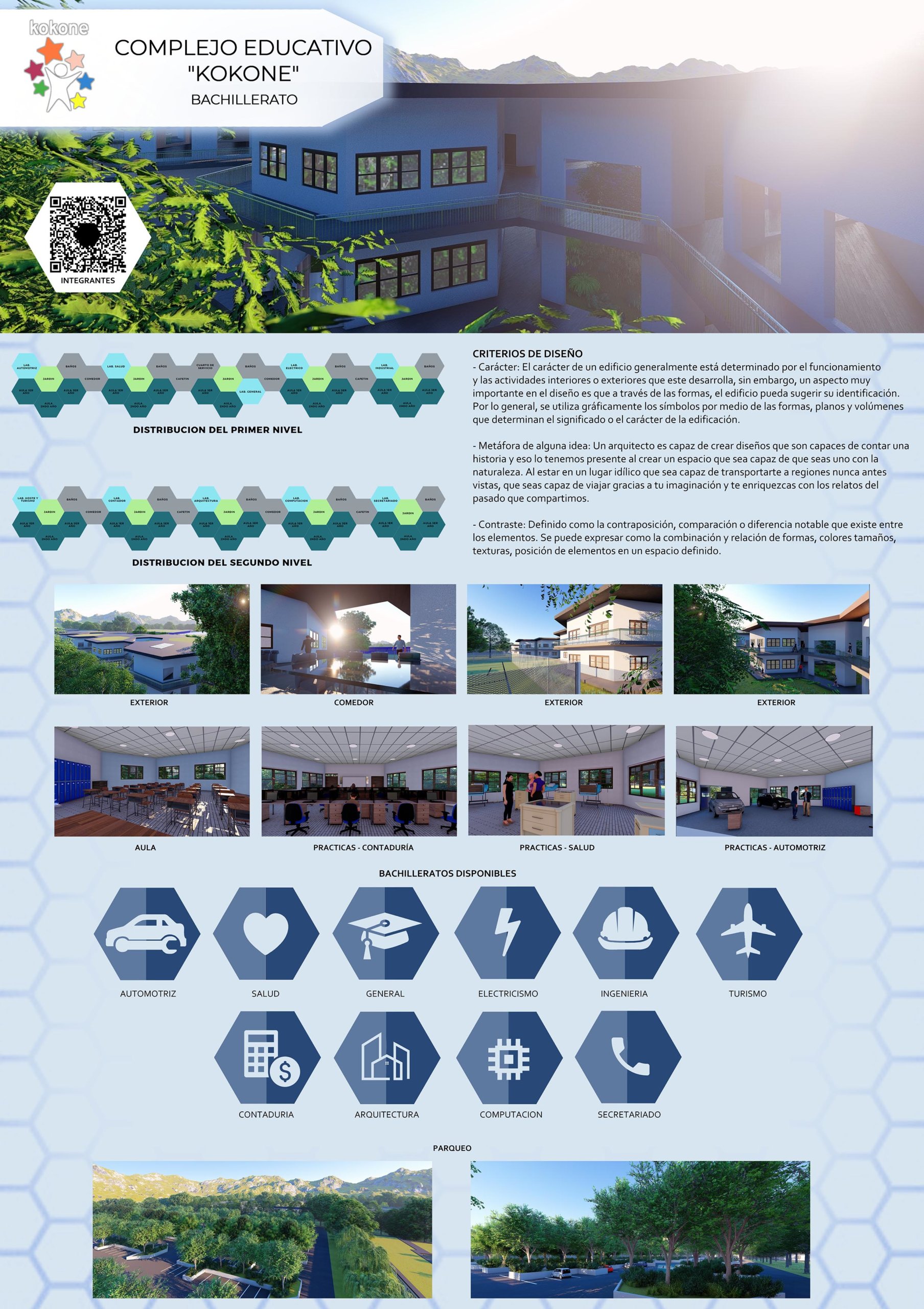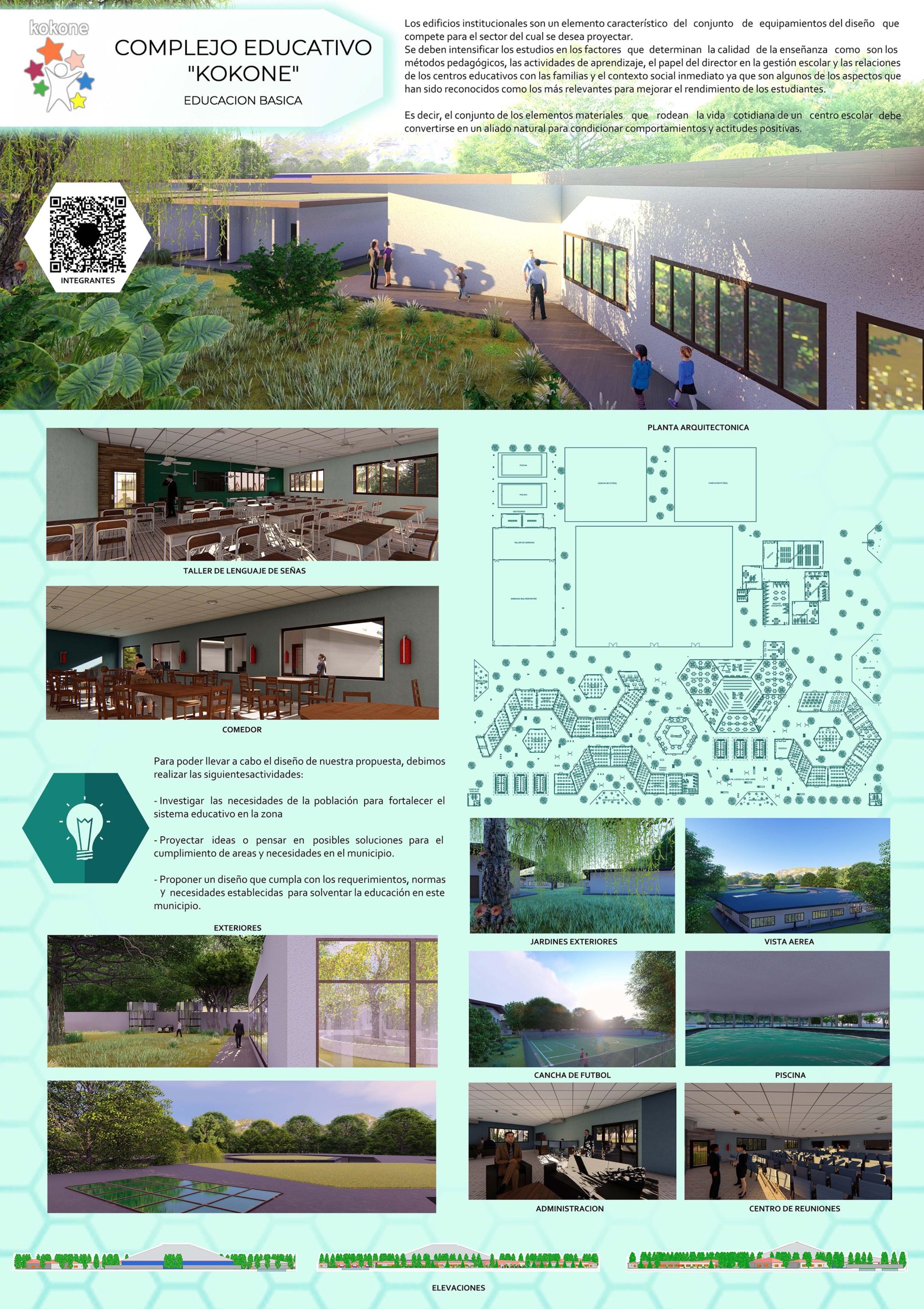 En vista de la necesidad y el crecimiento demográfico de esta área en San Miguel, ha quedado al descubierto la ahora pequeña capacidad que tienen los Centros educativos de la zona para poder albergar a todos los estudiantes, agregando a esta, nuestra vida Post-COVID. Se vuelve cada vez más imperante el proyectar nuevos espacios acordes a las necesidades de la población y de las nuevas exigencias sanitarias requeridas para evitar la proliferación de enfermedades altamente contagiosas, envista de todo lo anterior los centros educativos se queda corto en cuanto a capacidad se refiere, por lo tanto, proponemos un Complejo educativo con criterios de diseño ambientales, formales y funcionales; el cual se divide en 3 grandes zonas: