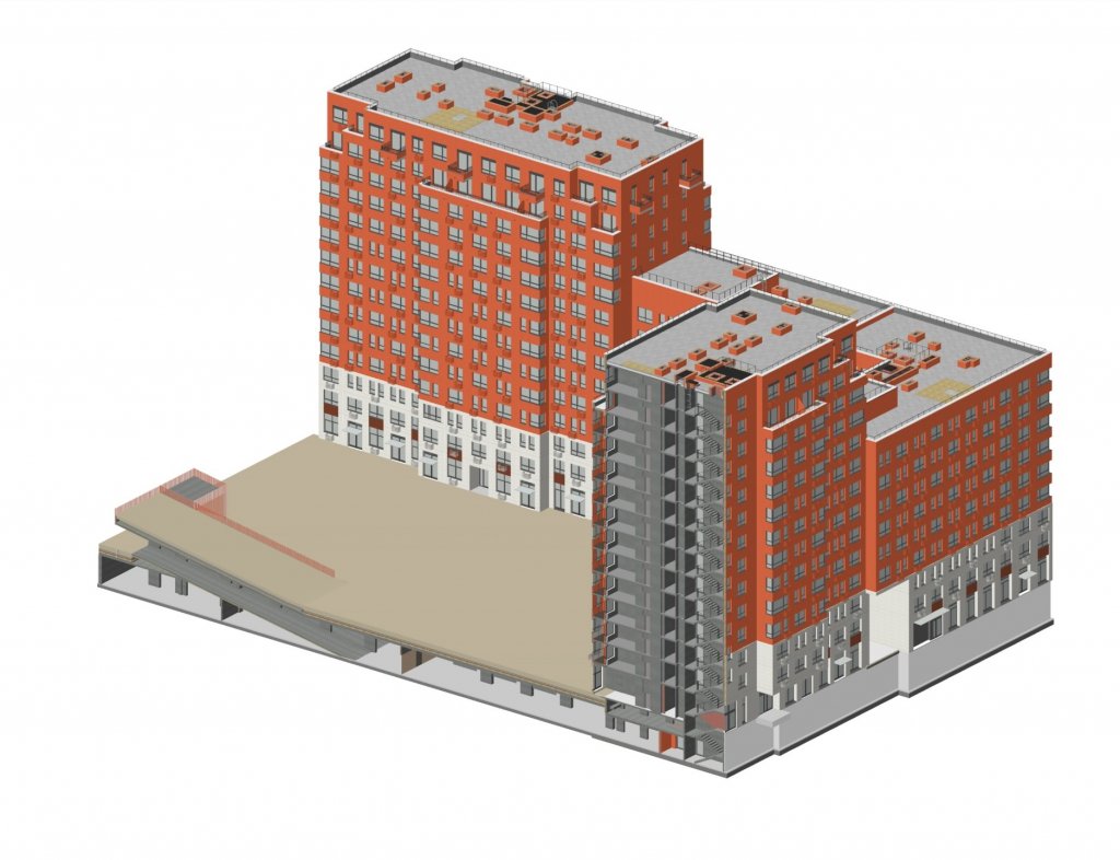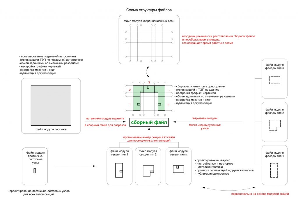 Работа над стадией «Проект» велась при помощи инструментов для командной работы (Teamwork), в ней было задействовано шесть проектировщиков. Трое из них занимались фасадами, двое – планами, один фокусировался на проектировании подземных паркингов. Было создано пять координационных файлов – в соответствии с количеством кварталов – и восемь модулей планировок, которые подгружались в соответствующий координационный файл с помощью инструмента «связанные модули». Файл каждого квартала обновлялся в начале недели, на основе актуальной информации велась работа по планировкам и фасадам.