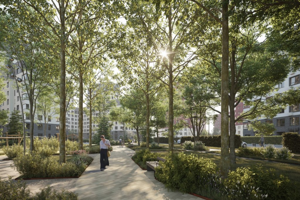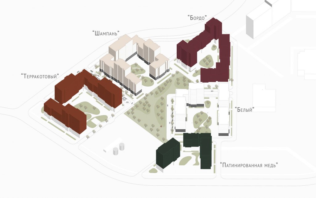 Работа над концептуальным решением заняла 2,5 месяца. Архитекторы DNK ag предложили заказчику проект с секциями домов минимальной высотой в 8 этажей и зданиями-доминантами в 14 этажей. Это позволило уменьшить масштаб двора, сделать его более камерным и заложить в проект крупное общественное пространство, объединяющее все кварталы, – парк.