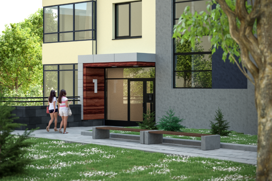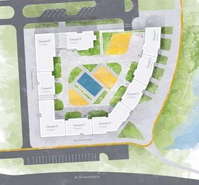 Проектное решение двора. Замкнутое расположение домов делает двор закрытым; здесь тихо и уютно, сюда не заезжают машины. Попасть внутрь можно через арки в седьмой и девятой секциях или же по лестнице рядом с въездом в паркинг, который находится ниже уровня двора.