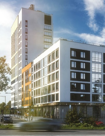 Архитекторы удачно определили цветовое решение и ритм здания. Панорамные лоджии и угловое остекление прекрасно сочетаются со стенами спокойных пастельных тонов. Разнообразие элементов здания не нарушает его целостности.