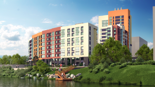 Первый квартал – это дом, с которого начинается район. Его проектированием и занималось ателье «Плюс». Высотность этажей гармонично распределена, пропорции здания сбалансированы. Дом расположился возле самой набережной, из его окон открывается прекрасный вид на город, холмы и лесной массив.