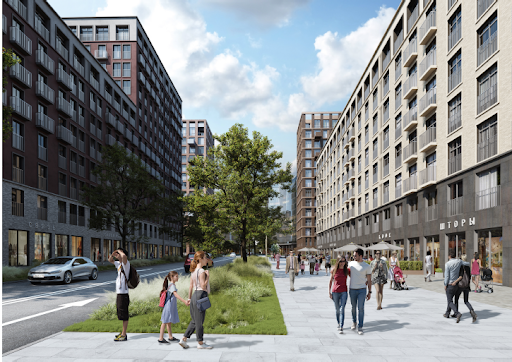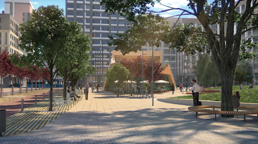 Архитектурное бюро Up-group расширило представление о многофункциональности и связанности района, предложив городскую торгово-пешеходную улицу в качестве альтернативы локальному бульвару; обособленные кварталы-башни для горожан для разбавления монотонной квартальной застройки и большой форматный офис, который может стать штаб-кварталом для высокотехнологичных компаний.