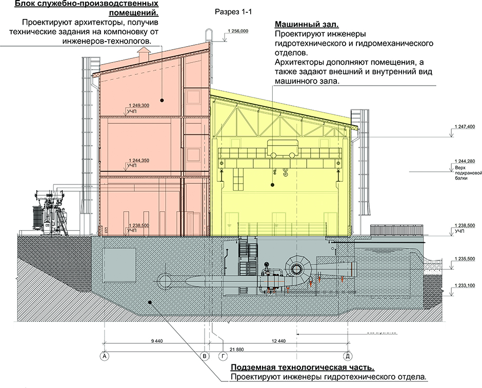 Взаимодействие архитекторов и инженеров при проектировании зданий ГЭС строится следующим образом. Архитекторы получают от инженеров смежных отделов технологические схемы и на их основе разрабатывают планировочные решения здания. Исходя из требуемой компоновки здания проектируются строительные конструкции. Архитектурно-строительный отдел выдает технологическим отделам в качестве технического задания чертежи строительных конструкций, которые они дальше используют как подоснову для размещения инженерных систем.