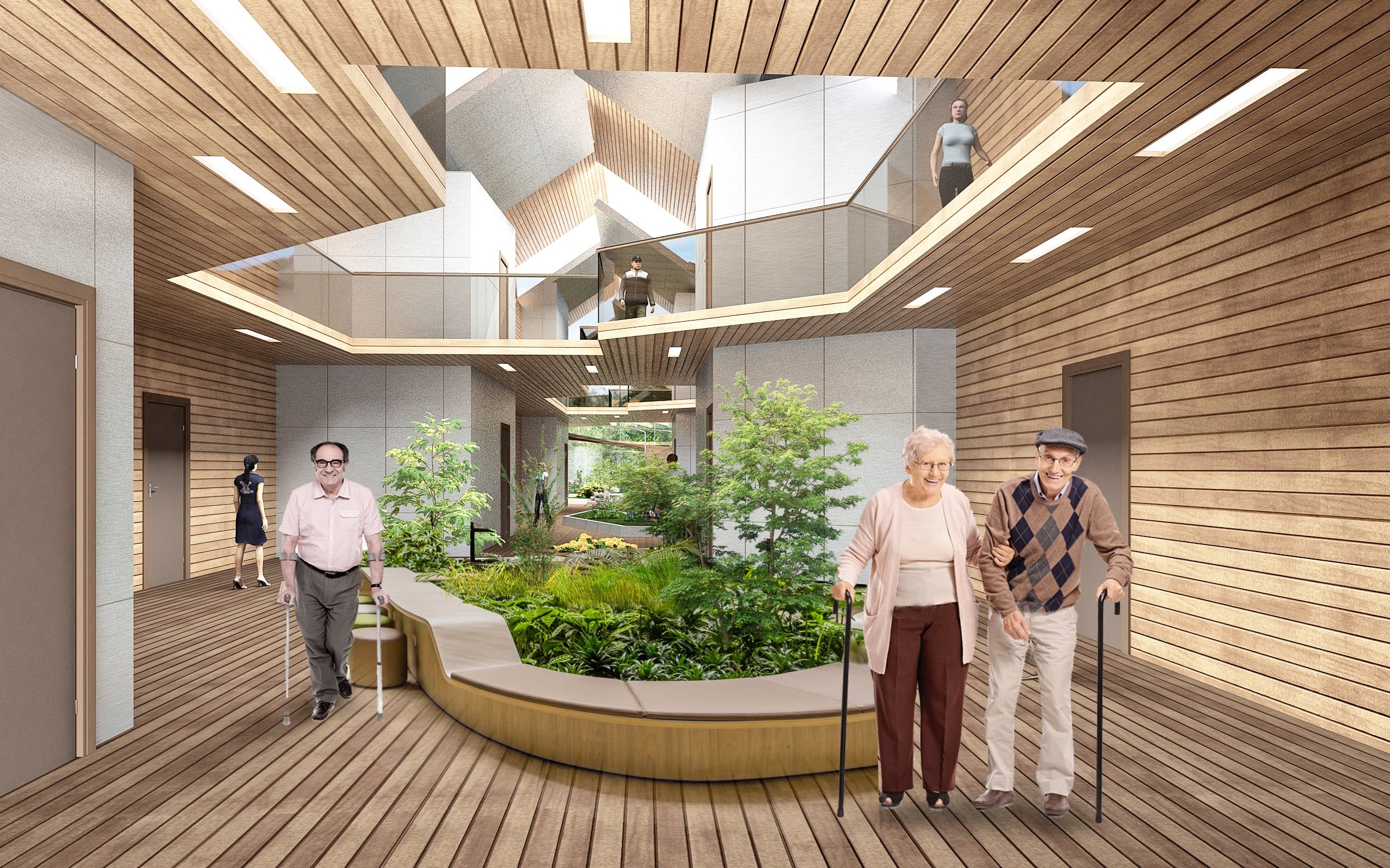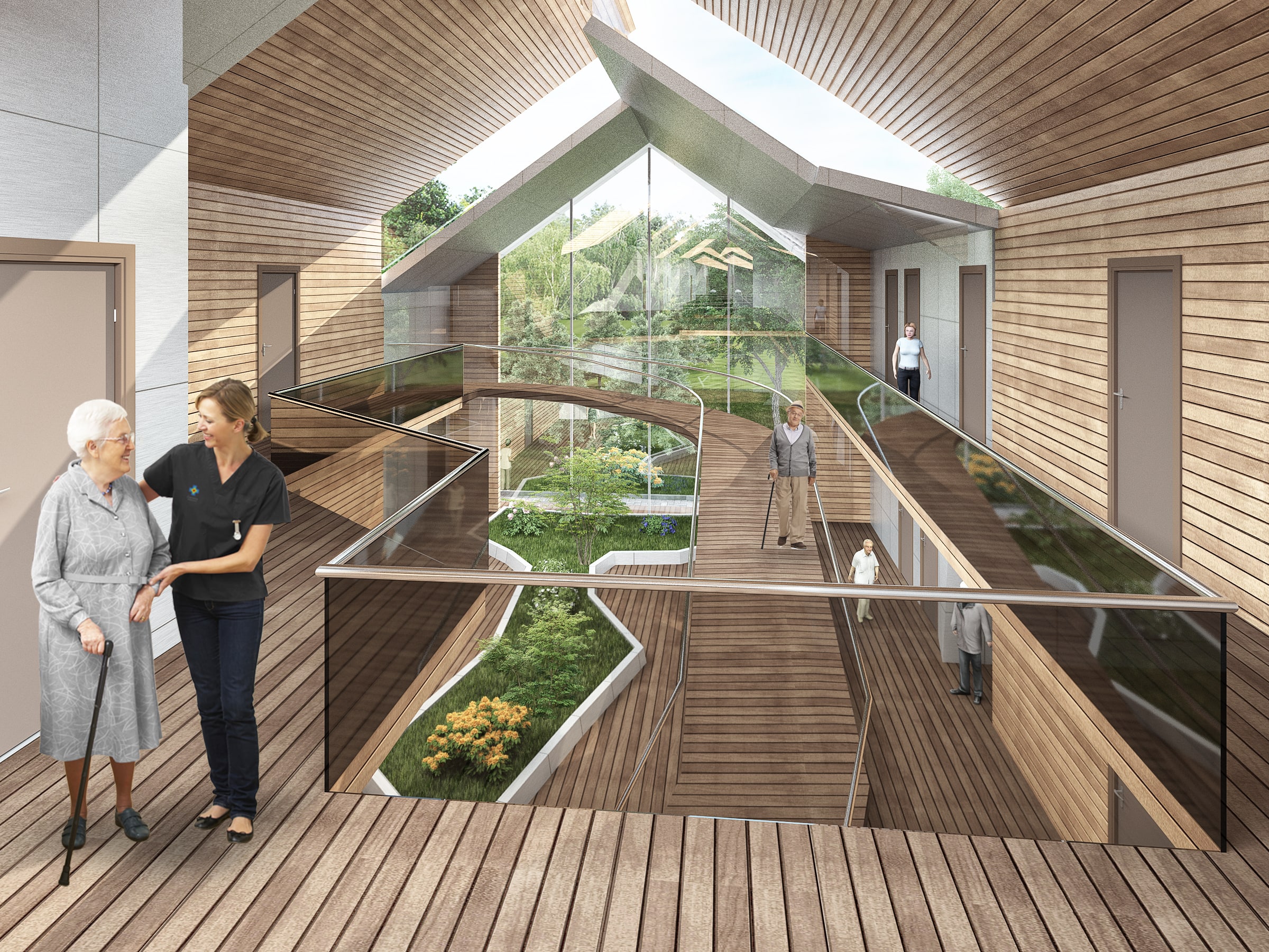 Внутреннее пространство жилой части представляет собой атриум-променад для постояльцев. Атриум полон света, за счет сплошного остекления торцевой стены здания, а также за счет остекления вертикальных проемом, образованных перепадами уровня кровли. В уровне первого этажа атриума располагается зимний сад. Для удобства пользования колясочниками, внутреннее пространство оснащено пандусами, вообще все помещения для постояльцев выполнены с учетом требований «безбарьерного доступа».