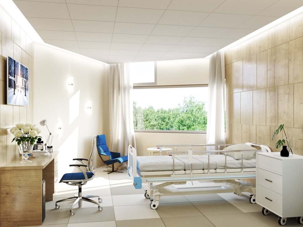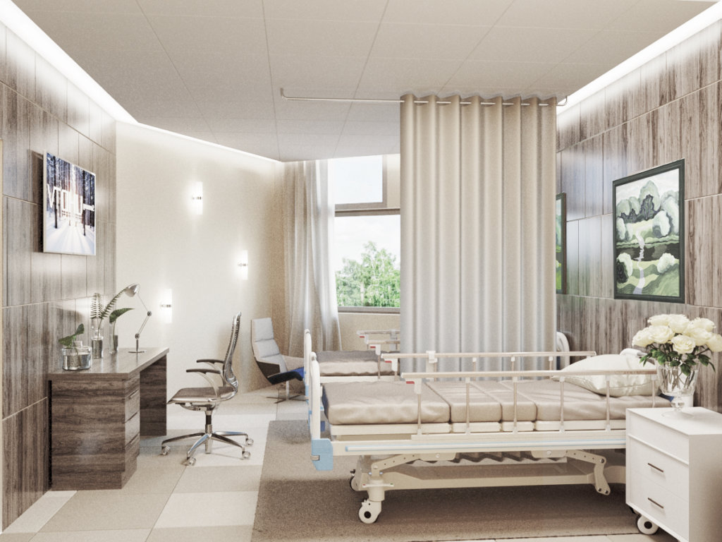 Вместо привычных номеров здесь размещены палаты, оборудованные кроватями-трансформерами, должна быть возможность подключения дополнительного медицинского оборудования. Дополнительно, архитектурное бюро уделило внимание безбарьерной среде, например, доступ на второй этаж жилого корпуса осуществляется по пандусу.