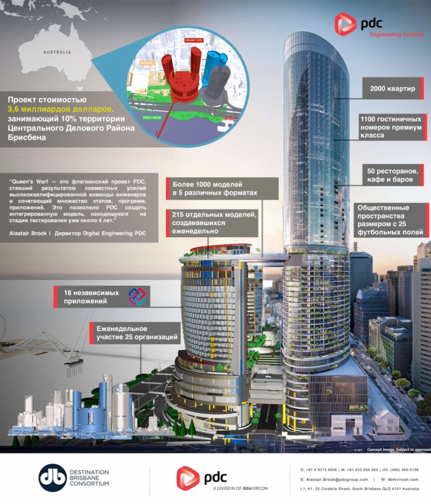 Проект Queen’s Wharf (Королевский Причал) получил престижную международную премию buildingSMART International за лучший дизайн. Эта награда стала признанием выдающегося уровня IFC-взаимодействия и реализации подхода Open BIM в компании PDC (являющейся подразделением DBM Vircon). Премия была вручена команде Digital Engineering за новаторские решения, примененные в процессе работы над проектом стоимостью 3,6 миллиардов долларов в австралийском городе Брисбен.