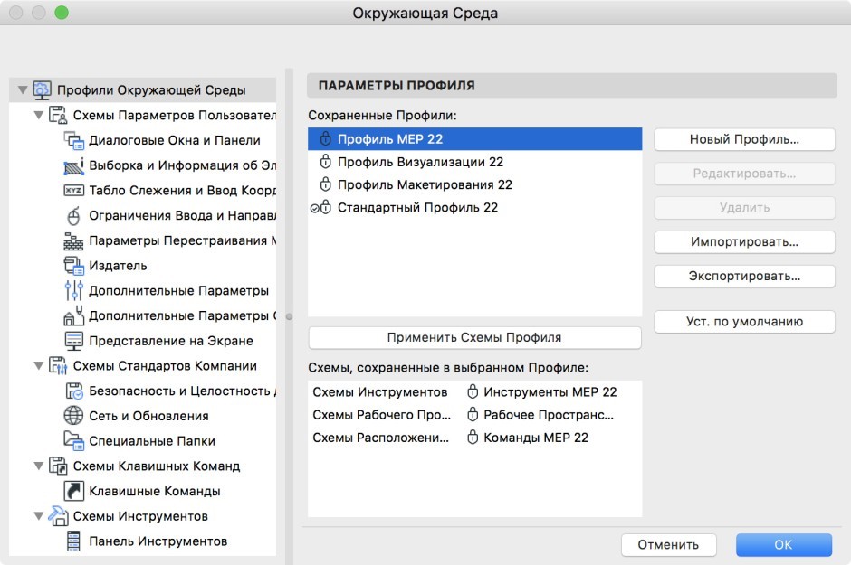 Запустите Archicad и воспользуйтесь командой меню Параметры >> Окружающая Среда >> Профили Окружающей Среды: