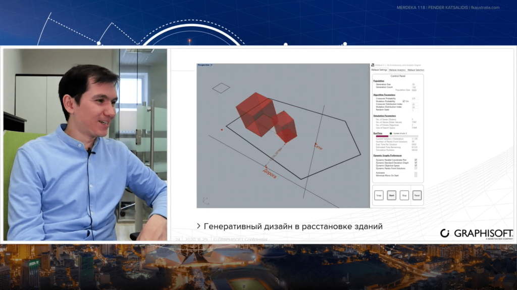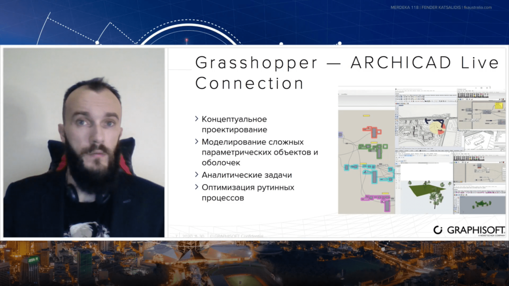 Далее по программе выступила команда преподавателей и студентов из МАРХИ и рассказала об опыте внедрения цифровых технологий в классическую школу своего института. Блок выступлений авторизованных учебных центров открыл основатель SkyArch School Азат Аюпов, который рассказал об основах градостроительного моделирования и анализа при помощи связки Archicad и Grasshopper.