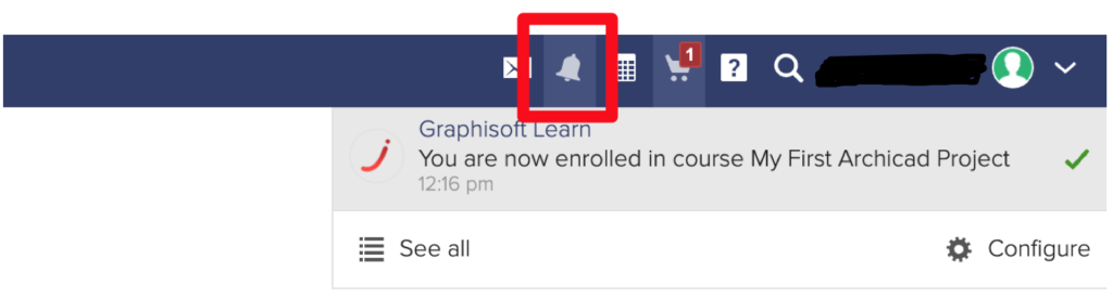 - Нажмите на значок колокольчика в правом верхнем углу (выделено красным), и вы можете начать курс
