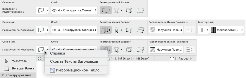 По умолчанию Табло Оперативных Параметров располагается в нижней части окна Archicad.