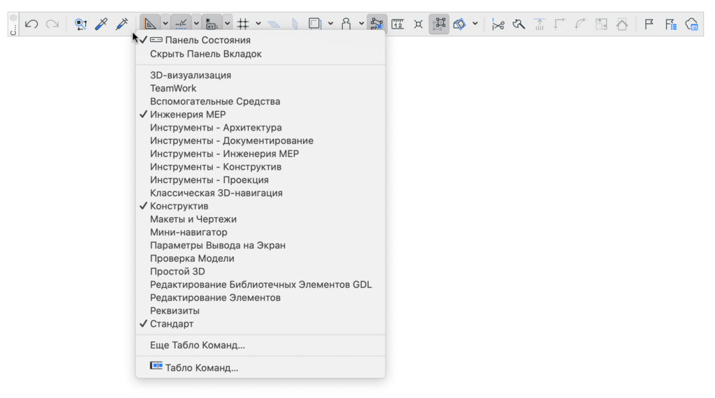 Кроме того, при активации Профилей Конструктора или MEP-инженера в ней появляются дополнительные инструменты, такие как воздуховоды трубы, конструктивные опоры или связи. Загрузка некоторых расширений тоже приводит к увеличению списка доступных инструментов.