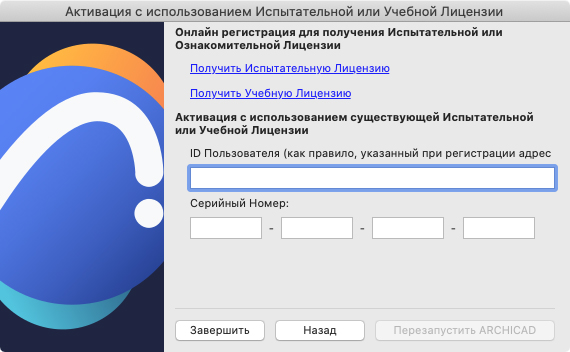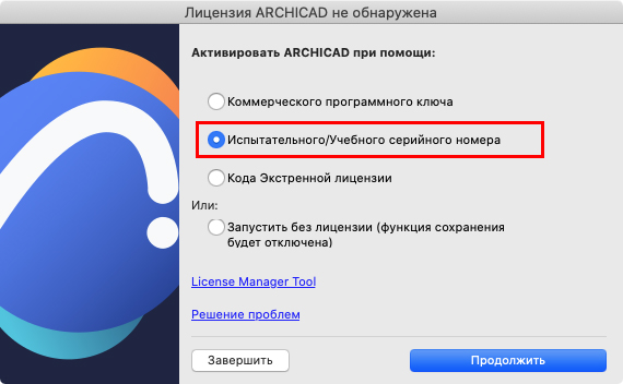 Активируйте Archicad при помощи серийного номера Пробной лицензии
