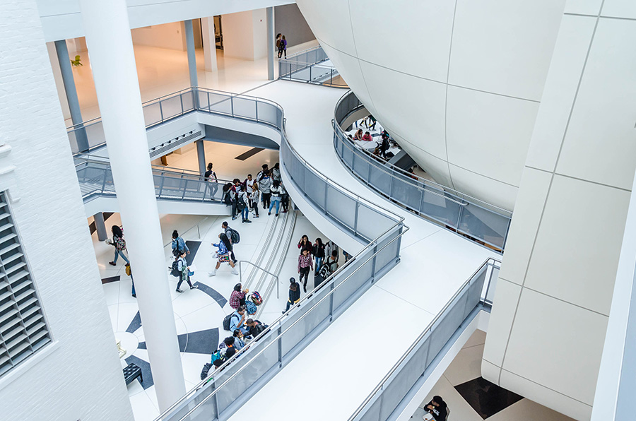 Surrounding the auditorium are academic spaces designed to foster inter-departmental awareness and collaboration; inviting the neighborhood to experience the fruits of its diverse programs.