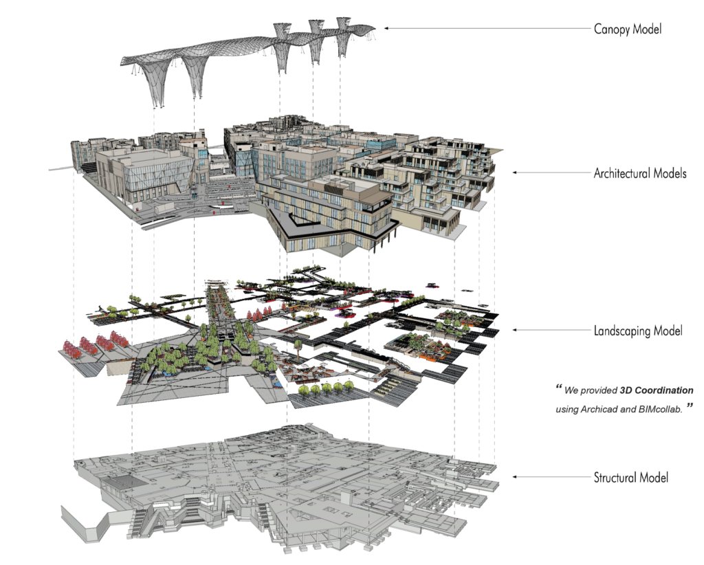 The project was designed within Archicad and involved the landscaping of a new city that embraces pedestrian-only public spaces by restricting car traffic to basement levels. Landscape design has been done by FSDC and the architectural design by CRTKL.