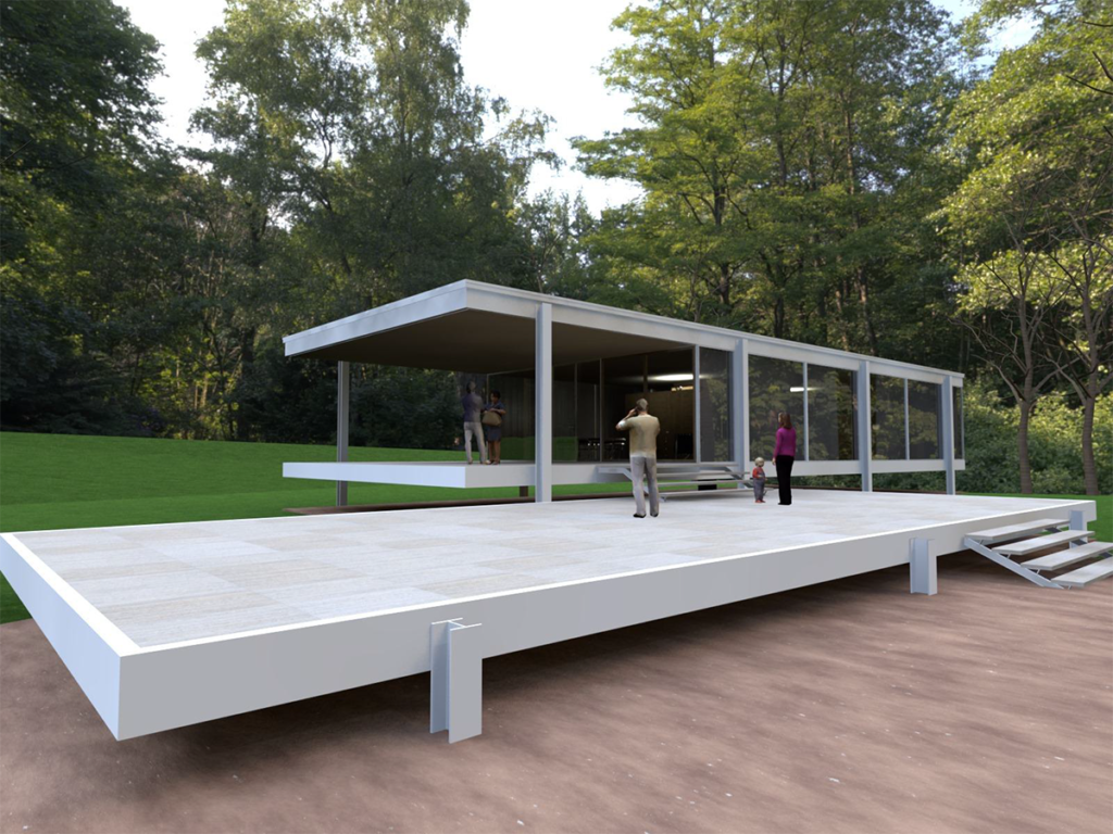 Farnsworth House is a steel and glass house constructed as a weekend retreat in Illinois, and is currently operated as a house museum. The Archicad project is highly developed and includes detailed construction drawings.