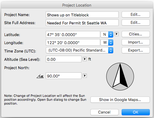- Project Location. Just like you set up Project Info, take the time to set up the project location. Find the right longitude and latitude. Set project north correctly. This will prevent errors when doing visualization.