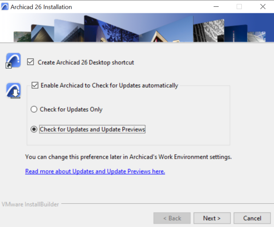 Set this preference (Check for Updates Only or Check for both Updates and Update Previews) during installation. You can change your notification preferences at any time in Archicad’s Work Environment dialog.