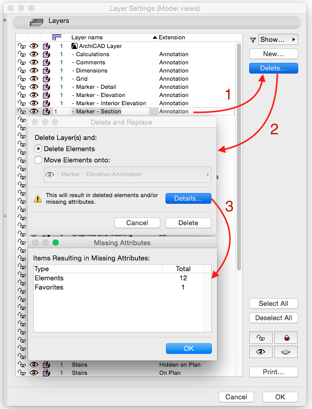 - Archicad will warn you if deleting the Layer will result in the loss of elements and/or missing attributes. If that’s the case, you can click on details to learn a little more. If there are no elements, delete away. If there are: