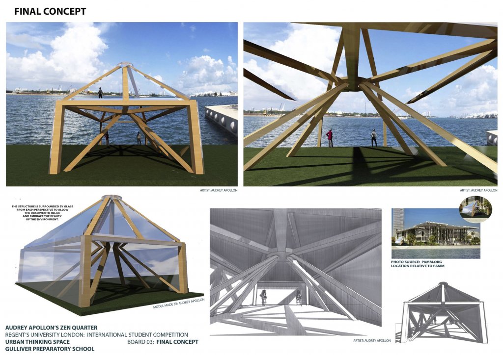 The IN-BETWEEN SPACE competition invites students to design an Urban Thinking Space, which carefully frames, highlights or reveals an unusual and surprising ‘view’ and provides an environment for contemplating, dreaming and pondering. Audrey Apollon, now a senior, won first place as a junior in the IN-BETWEEN SPACE competition. She and two of her fellow classmates who were finalists in the competition were invited to travel to London to see their work on exhibition and for the awards ceremony.