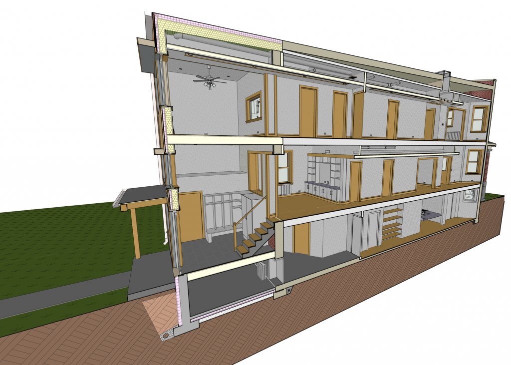 “Winter heating makes up so much of our energy use in this part of the country so we examined that aspect in the model – turning on and off the layers for existing and demolition. We modeled all the duct work and designed an internal soffit that would carry the ventilation air and some integrated lighting. It was rudimentary modeling, but critical for sizing and making sure it all worked together. We gutted the interior and placed new insulation as well as air sealing and new mechanical systems – which provide passive house ventilation levels.”