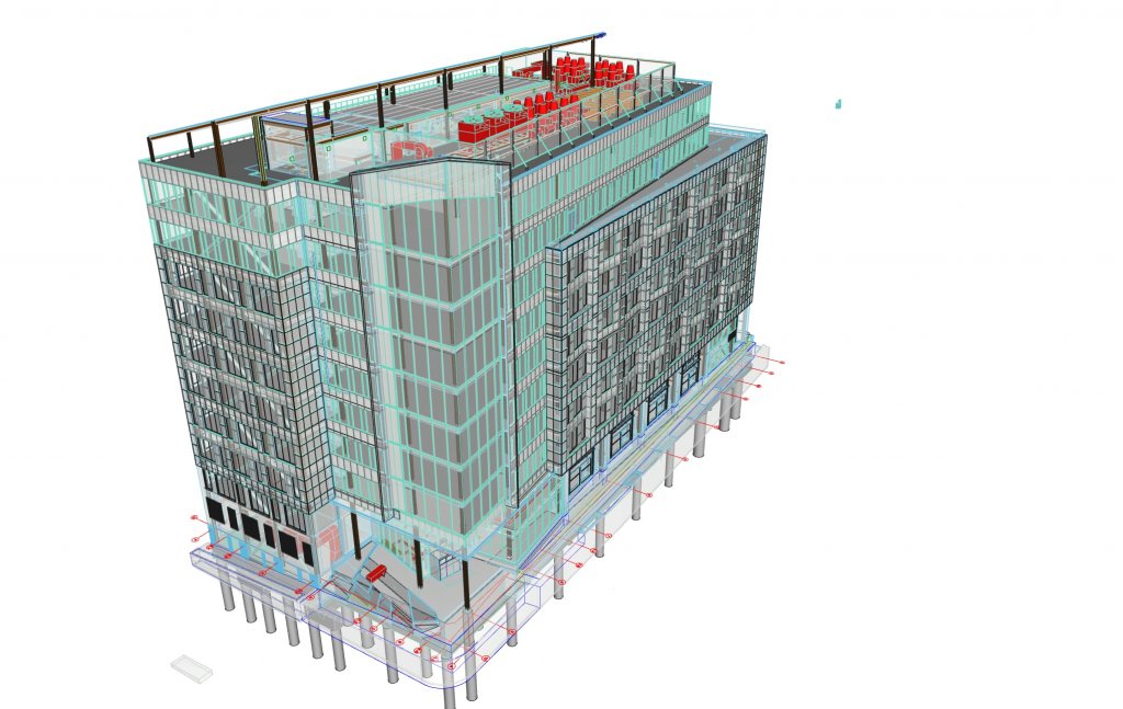 Given that the end use of each tenant space depends on what each occupant needs, Strada worked to make the building as flexible as possible. IFC coordination enters here as they worked with structural and mechanical engineers. As the model is coordinated between disciplines, each participant can evaluate potential issues with ceiling heights, ductwork or needing to adjust steel structures.